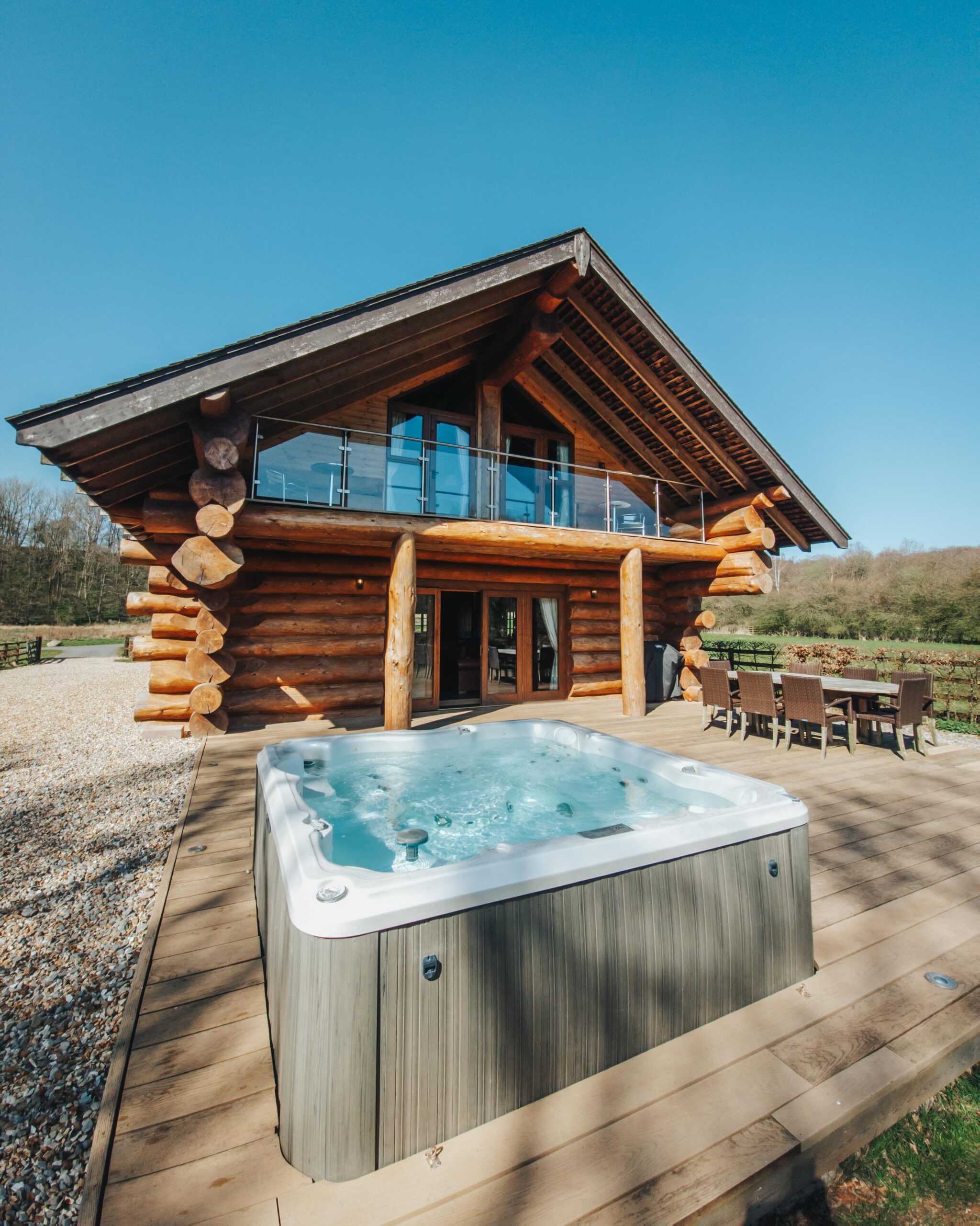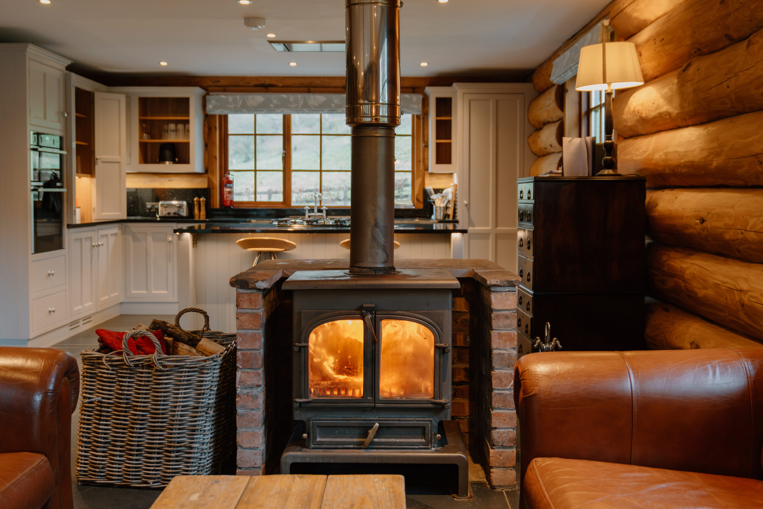 A clear view wood burner in the middle of the open plan living/kitchen area will keep you snug all year round and there is also a large hot tub on the decking from which you can watch the river Lyne and try and spot any fish rising or kingfishers going about their day.